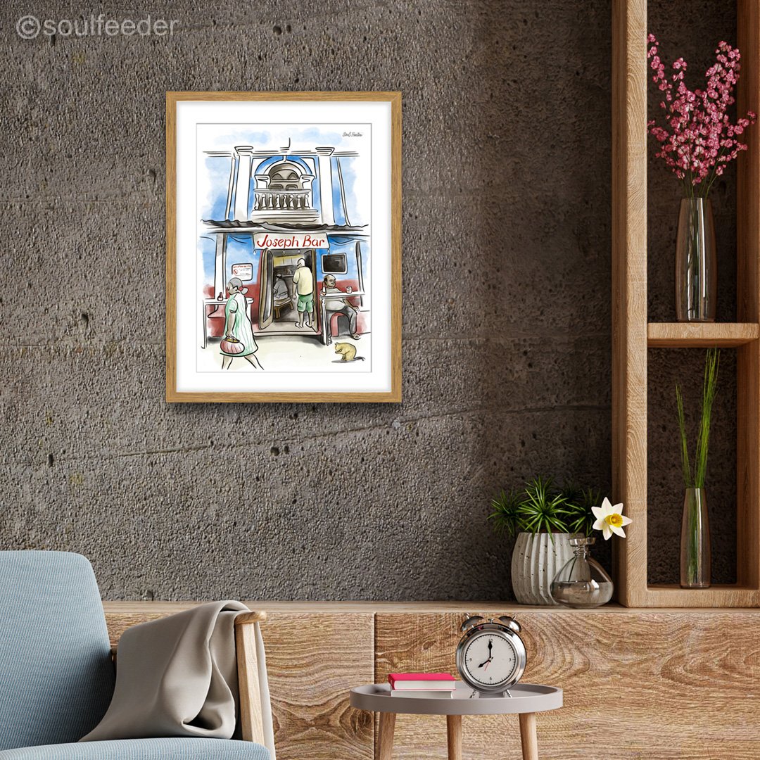 The Soul Stop series is an homage to all Gullys, Bars and Restaurants that just seem to hold our soul. Each artwork is printed on 300gsm HP paper and mounted on 400gsm handmade paper. With 2 options of frames (white and wooden) available, match with the wall of your desire. Moreover options are also available in size to suit the space and mood available.